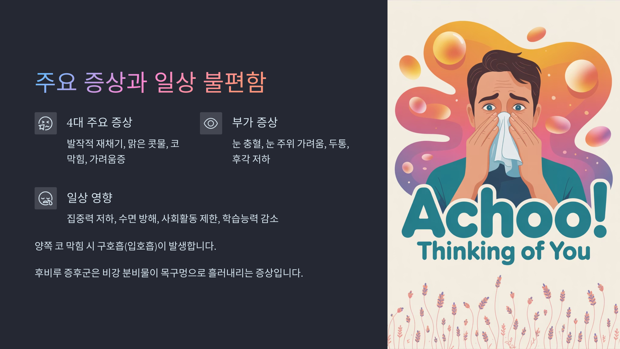 원인에 따라 치료 방법이 다르기 때문에, 자신이 겪는 비염의 유형을 정확히 아는 것이 첫걸음이에요. 그럼 다음으로 비염이 나타내는 구체적인 증상들을 알아볼게요!