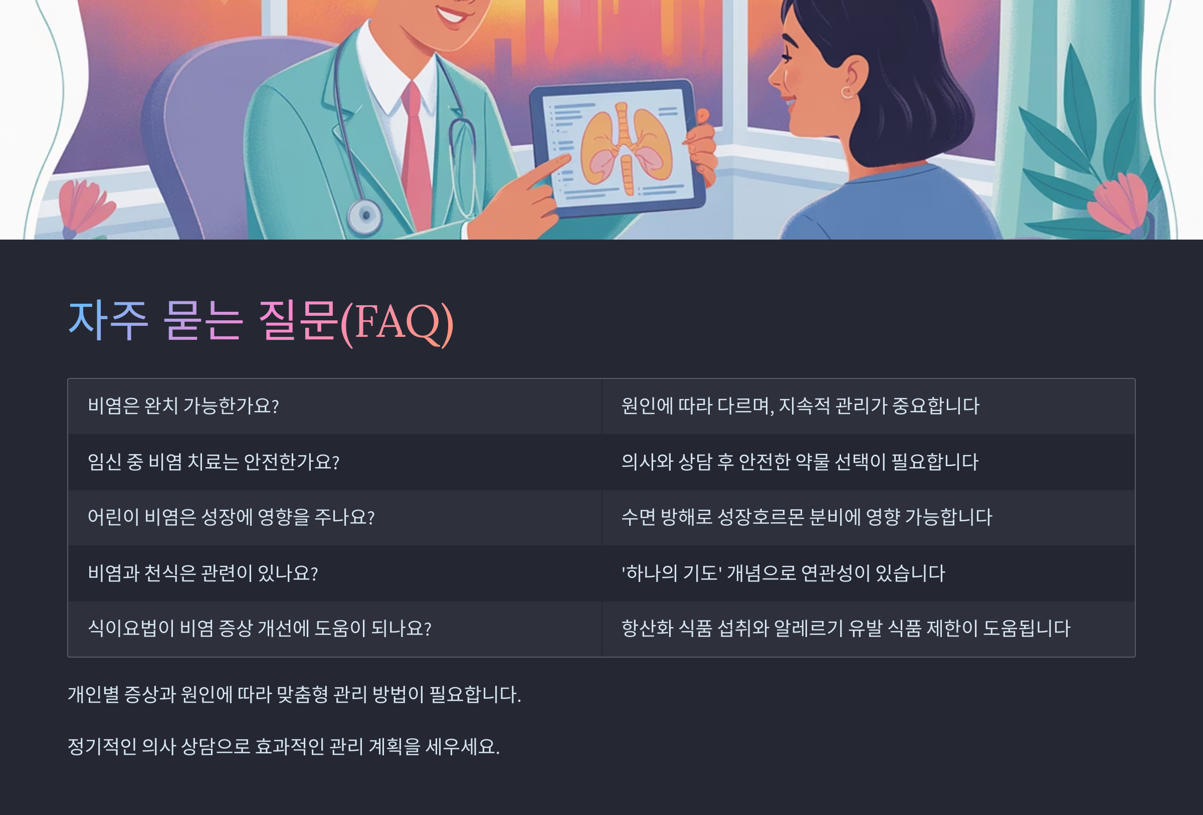 Q1. 비염은 완치가 가능한가요?A1. 완치는 어렵지만 꾸준한 치료와 환경 관리로 증상을 크게 줄일 수 있어요. 특히 알레르기 유발 요인을 정확히 파악하고 피하는 것이 중요해요.