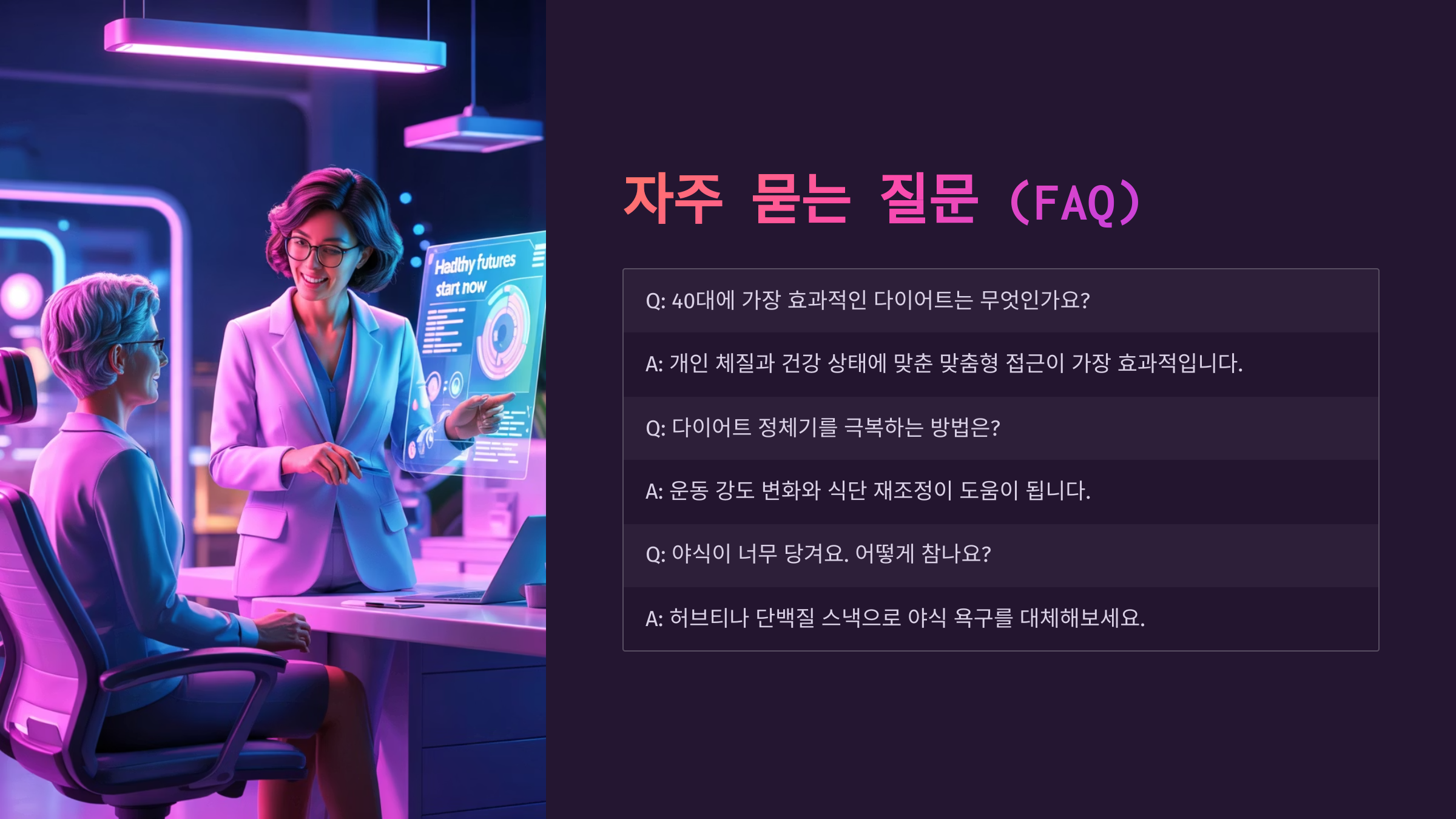 Q1. 40대는 진짜 살 빠지기 힘든가요?A1. 신진대사는 느리지만, 꾸준히 실천하면 분명히 빠져요. 다만 시간이 좀 더 걸릴 뿐이에요.