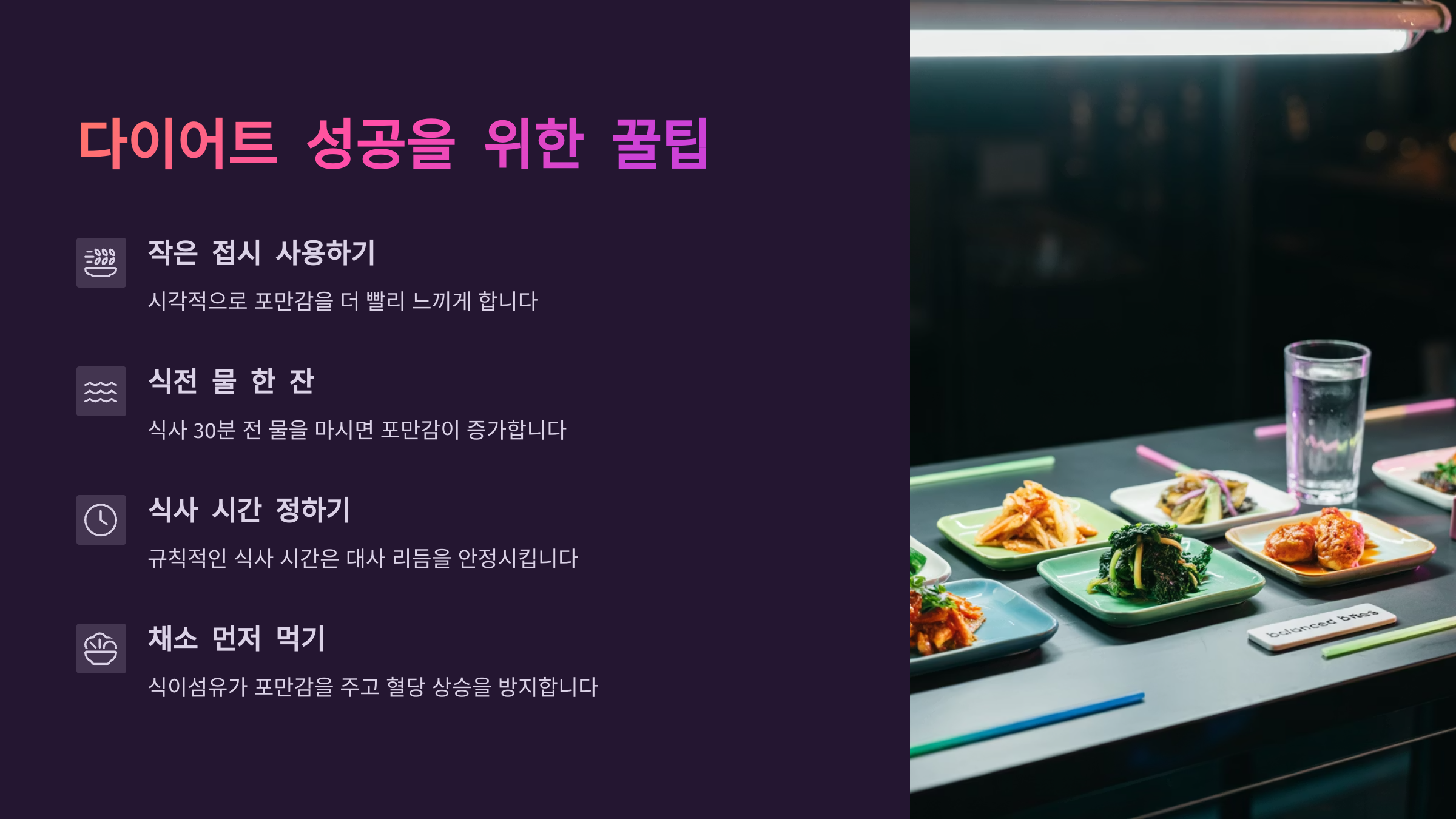 - 🚫 굶지 말고, 먹되 좋은 음식 위주로